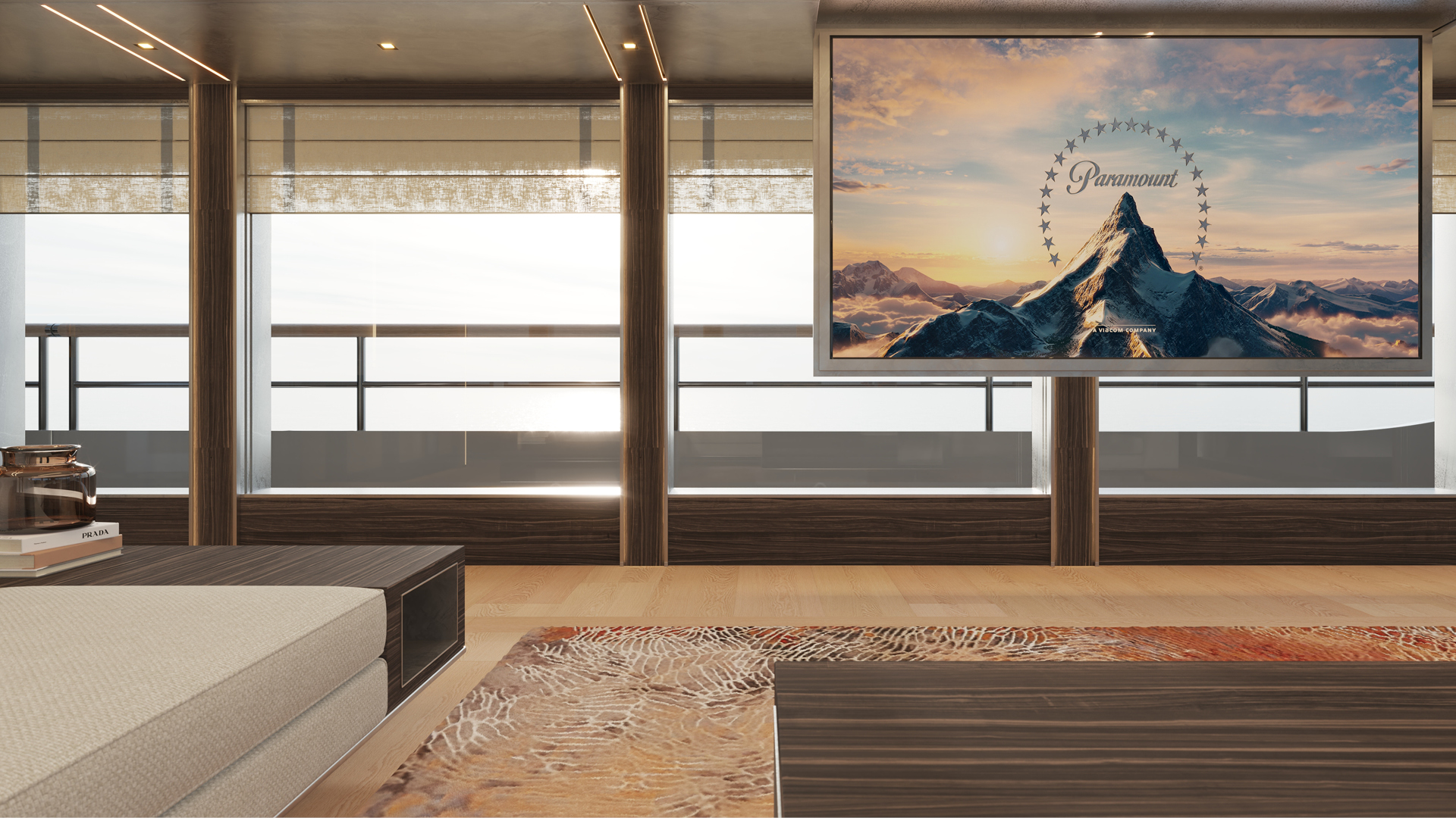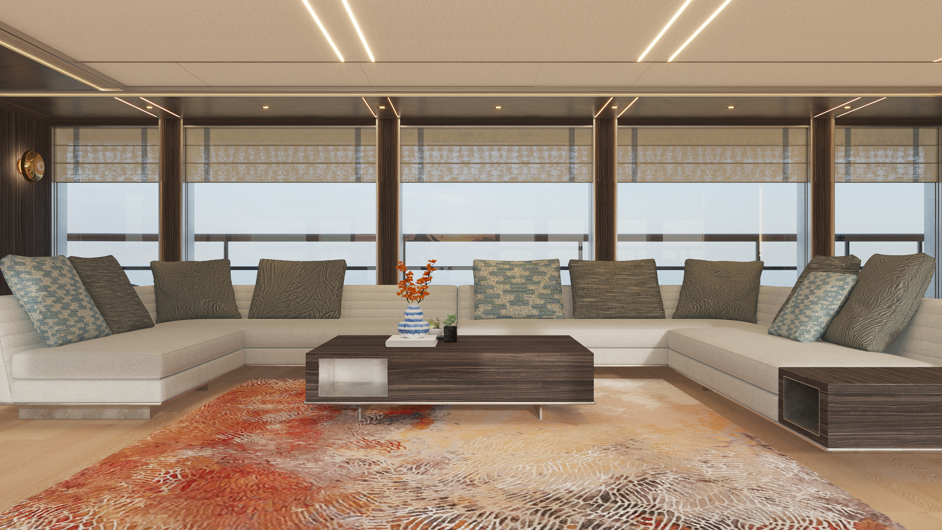 Soft, tailored furnishings, warm wood finishes, and carefully selected materials contribute to a welcoming atmosphere that feels both elegant and effortless. A discreet entertainment system is integrated into the design, preserving visual clarity while offering flexibility for informal use. Whether enjoying a book, hosting guests, or simply unwinding after a day of exploration, the lounge provides a calm and comfortable escape — perfectly in tune with the yacht’s spirit of long-range, thoughtful travel.